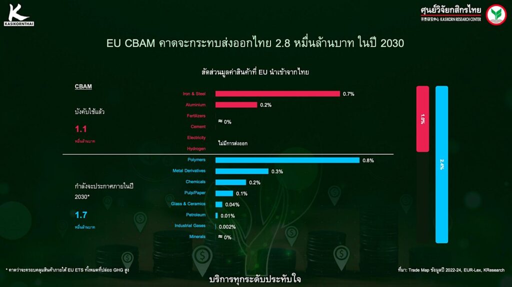 ศูนย์วิจัยกสิกรไทย ชี้สหภาพยุโรป (EU) จ่อเริ่มเก็บภาษีคาร์บอน (CBAM) ต้นปีหน้า คาดส่งผลกระทบต่อการส่งออกของไทยเพิ่มมากขึ้นเป็นราว 2.8 หมื่นล้านบาท ภายในปี 2573
