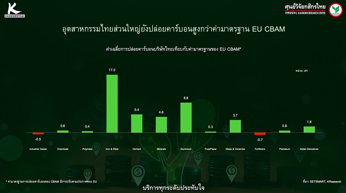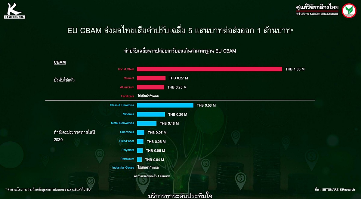 ดร.รุจิพันธ์ อัสสะรัตน์ ผู้ช่วยกรรมการผู้จัดการ บริษัท ศูนย์วิจัยกสิกรไทย จำกัด กล่าวเพิ่มเติมว่า EU CBAM มีแนวโน้มที่จะส่งผลกระทบต่อการส่งออกของไทยมากยิ่งขึ้น จากปัจจุบันที่ครอบคลุมมูลค่าสินค้าเพียง 1.1 หมื่นล้านบาท เพิ่มขึ้นเป็นราว 2.8 หมื่นล้านบาทภายในปี 2573 ทั้งนี้ แม้ว่าผู้ประกอบการไทยจะพยายามปรับตัวโดยดำเนินกิจกรรมลดก๊าซเรือนกระจก แต่อุตสาหกรรมส่วนใหญ่ยังคงปล่อยก๊าซเรือนกระจกเกินกว่าค่ามาตรฐานของ EU CBAM ทำให้ศูนย์วิจัยกสิกรไทยประเมินว่า อาจต้องเสียค่าปรับโดยเฉลี่ย 5 แสนบาทต่อการส่งออกสินค้า 1 ล้านบาทไปยัง EU หรือคิดเป็นสัดส่วนที่สูงถึง 50% เลยทีเดียว