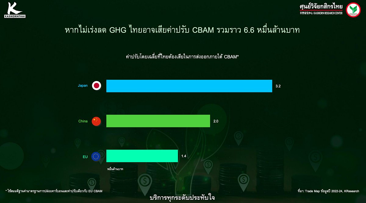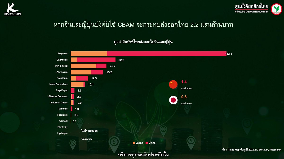 นอกจากนี้ ยังมีแนวโน้มที่จีน (ตลาดส่งออกลำดับ 2 สัดส่วน 11%) และญี่ปุ่น (ตลาดส่งออกลำดับ 4 สัดส่วน 7%) จะดำเนินมาตรการในทำนองเดียวกัน ทำให้ผู้ประกอบการไทยต้องเร่งลดการปล่อยก๊าซเรือนกระจกและเปิดเผยข้อมูลคาร์บอนเพื่อคงความสามารถในการแข่งขัน ซึ่งหากท้ังจีนและญี่ปุ่น เริ่มใช้มาตรการ CBAM คาดว่าจะกระทบส่งออกไทยมูลค่ากว่า 2.2 แสนล้านบาท