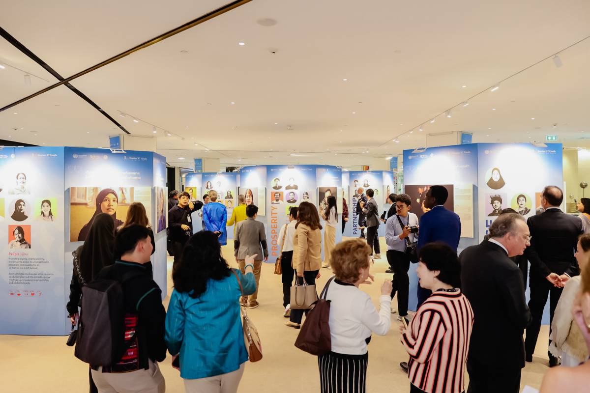 นิทรรศการภาพถ่ายชุดพิเศษ “30 Stories, 17 Goals, One Road to 2030” ถ่ายทอด 30 เรื่องราวจากผู้คนทั่วประเทศไทยที่เป็นแรงบันดาลใจในการขับเคลื่อน 17 เป้าหมายการพัฒนาที่ยั่งยืน อาทิ นางสาวซัลมา กาแด เยาวชนจากจังหวัดยะลา ที่ได้รับโอกาสทางการศึกษาอีกครั้งผ่านโครงการ Learning Coin ขององค์การยูเนสโก (UNESCO) จนสามารถพัฒนาทักษะภาษาไทยได้อย่างมั่นใจและก้าวขึ้นมาเป็นผู้นำเยาวชนในการอนุรักษ์มรดกทางวัฒนธรรมของชุมชน นางสาวสโรชา กิตติสิริพันธุ์ ผู้ประกอบการสังคมผู้พิการทางสายตา ผู้ก่อตั้ง PaperyBfly และจัดทำพอดแคสต์เพื่อส่งเสริมความเท่าเทียมและลดอคติในสังคมผ่านโครงการ Youth Co:Lab ของโครงการพัฒนาแห่งสหประชาชาติ (UNDP) และนายสุมิตร ศรีวิสุทธิ์ เกษตรกรและผู้นำชุมชนจากจังหวัดนครศรีธรรมราช ผู้ประยุกต์ใช้แนวทางเกษตรยั่งยืนจากองค์การอาหารและเกษตรแห่งสหประชาชาติ (FAO) เพื่อเพิ่มผลผลิตและรายได้ พร้อมถ่ายทอดความรู้ให้แก่เกษตรกรในชุมชนด้วยความเชื่อว่า การเกษตรไม่เพียงสร้างมูลค่าทางเศรษฐกิจ แต่ยังเติมเต็มคุณค่าของชีวิตมนุษย์