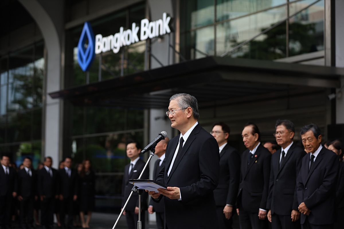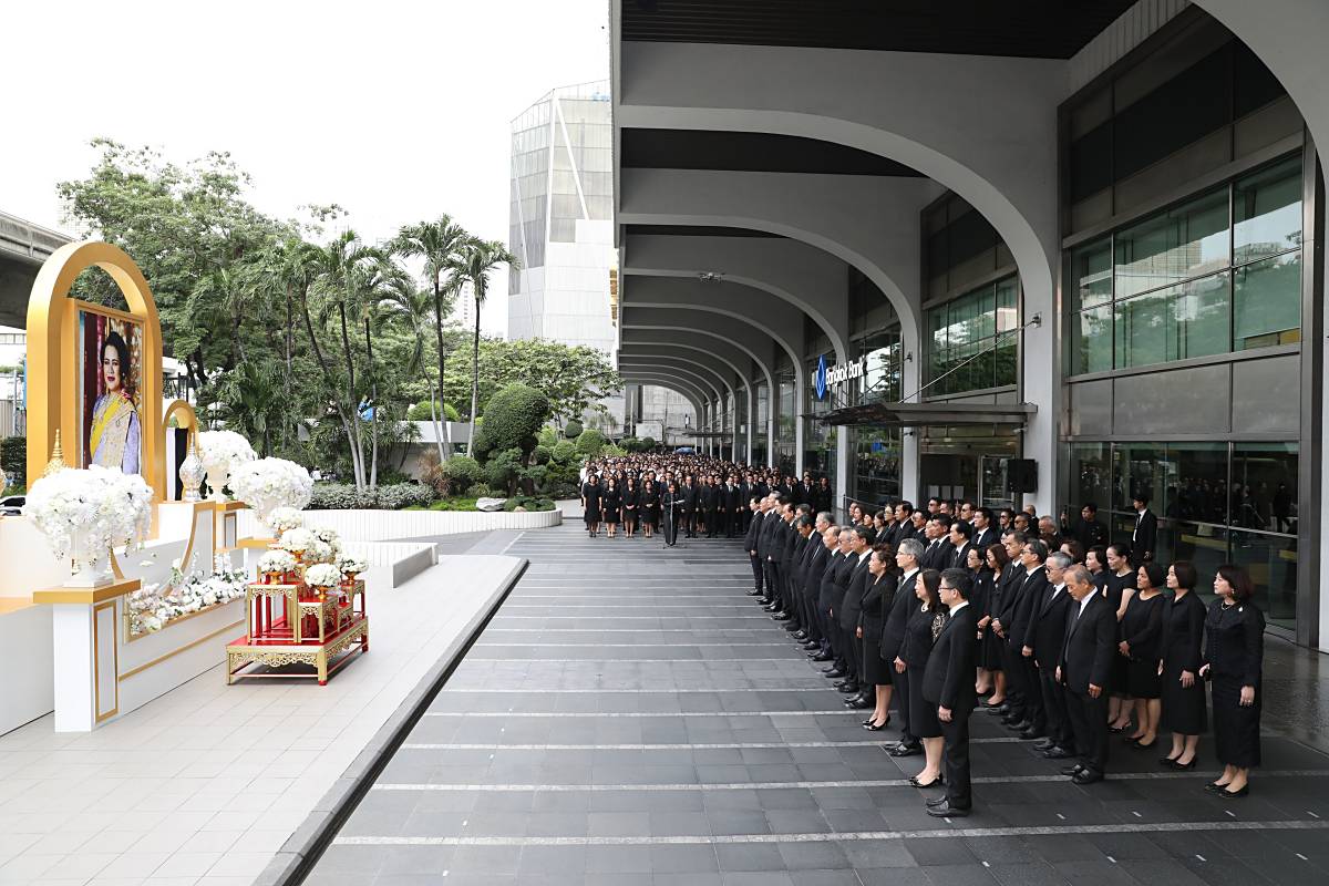 โดยมีตัวแทนพนักงานอ่านบทกวี ‘ฝากฟ้าดิน’ แสดงความอาลัย ประพันธ์โดย นายเนาวรัตน์ พงษ์ไพบูลย์ ศิลปินแห่งชาติ ที่ปรึกษาศูนย์สังคีตศิลป์ ฝ่ายการประชาสัมพันธ์ จากนั้น กรรมการผู้จัดการใหญ่ ได้กล่าวนำแสดงความอาลัย และนำยืนสงบนิ่งเป็นเวลา 93 วินาที ณ ลานด้านหน้าอาคาร ธนาคารกรุงเทพสำนักงานใหญ่ ถนนสีลม