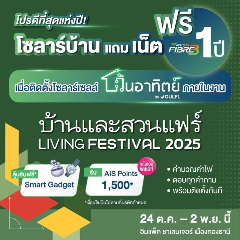 ‘วันอาทิตย์’ by GULF1 ผู้ให้บริการโซลาร์รูฟท็อปครบวงจร ชวนคนรักบ้านมาลงทุนอย่างคุ้มค่า ประหยัดจริง คืนทุนไว ในงาน ‘บ้านและสวนแฟร์ LIVING FESTIVAL 2025′ วันนี้ – 2 พฤศจิกายน 2568 ณ อิมแพ็ค ชาเลนเจอร์ เมืองทองธานี ตอกย้ำความพร้อมก้าวสู่ผู้นำตลาดด้วยการนำเสนอโซลูชั่นที่มุ่งเน้นการยกระดับคุณภาพชีวิตและมอบ ‘พลังงานดีๆ’ ให้กับทุกครอบครัว ภายใต้แนวคิด Smart Living – Smart Well-Being อย่างยั่งยืน