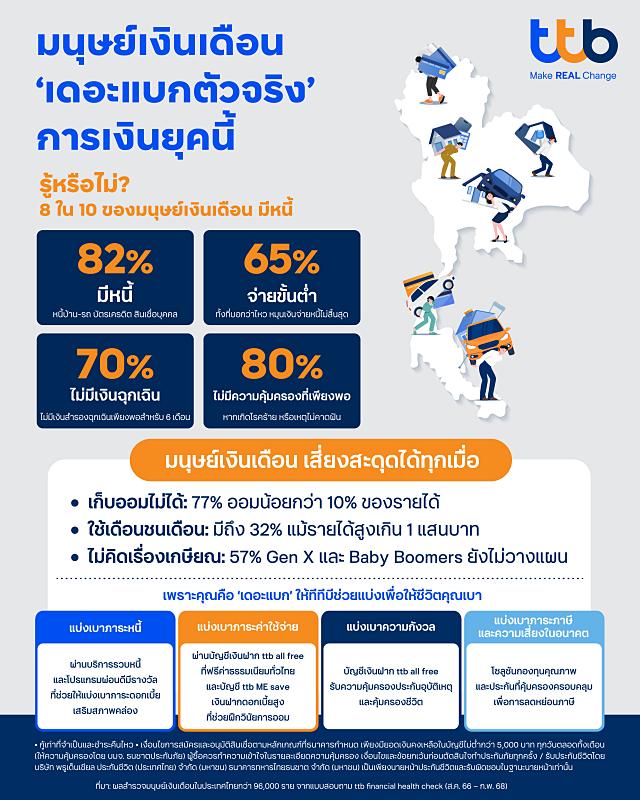 ทั้งนี้ จากการทำ ttb financial health check หรือโปรแกรมตรวจสุขภาพทางการเงินออนไลน์ของมนุษย์เงินเดือนในประเทศไทยกว่า 96,000 คน ระหว่างเดือนสิงหาคม 2566 – กุมภาพันธ์ 2568 พบว่า 8 ใน 10 หรือกว่า 82% ของมนุษย์เงินเดือนมีภาระหนี้ จากภาระที่มากขึ้น รายจ่ายที่มากขึ้น และปริมาณหนี้ที่เพิ่มมากขึ้น โดยส่วนใหญ่เป็นหนี้ส่วนบุคคลและบัตรเครดิตคิดเป็นสัดส่วนถึง 53% (รองลงมาคือหนี้รถคิดเป็น 17% และหนี้บ้าน 15%) และราว 60% ของมนุษย์เงินเดือนที่กำลังมีความเสี่ยงทางการเงิน และไม่มีเงินสำรองฉุกเฉินเพียงพอ