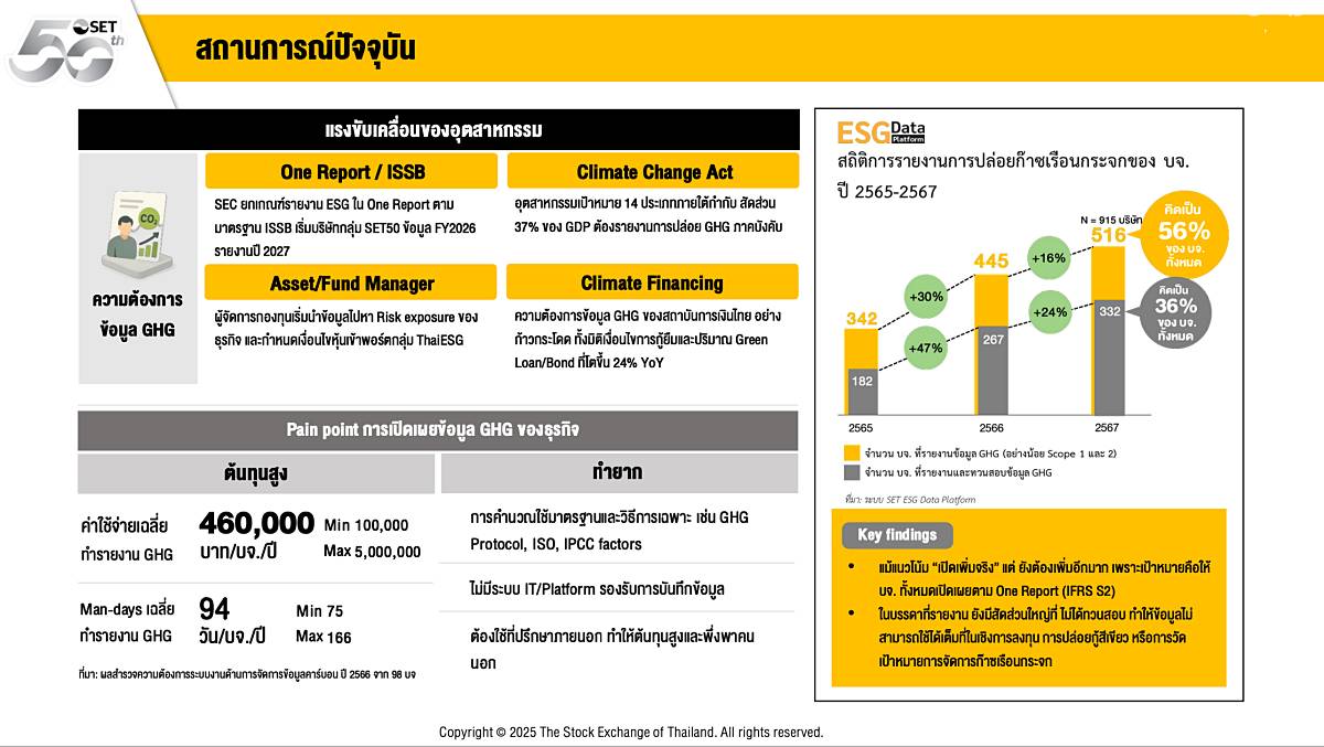 ขณะที่ข้อมูลล่าสุด แม้จะมีการรายงานและทวนสอบมากขึ้น แต่เมื่อเทียบกับจำนวน บจ. ที่อยู่ในตลาดฯ ก็ยังถือว่าน้อยอยู่มาก ทั้งที่กลุ่ม บจ. ถือเป็นกลุ่มธุรกิจที่มีทรัพยากรมากกว่าผู้ประกอบการรายเล็ก รวมทั้งข้อมูลที่ยังไม่ได้รับการ Verify ก็ยังไม่สามารถนำไปใช้งานหรือยืนยันข้อมูลได้จริง นำมาสู่การพัฒนา SETCarbon เพื่อเป็นทางเลือกที่ทั้ง ‘ง่าย และ ฟรี’ ช่วยให้ธุรกิจสามารถเปิดเผยข้อมูล GHG ได้สะดวกมากขึ้น