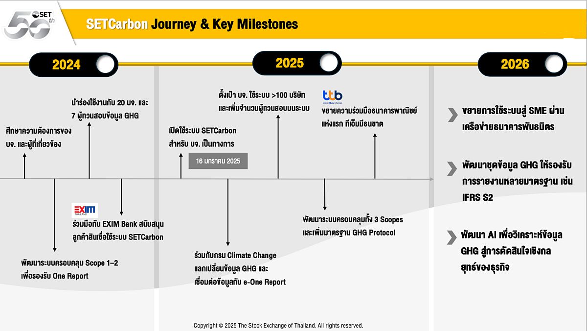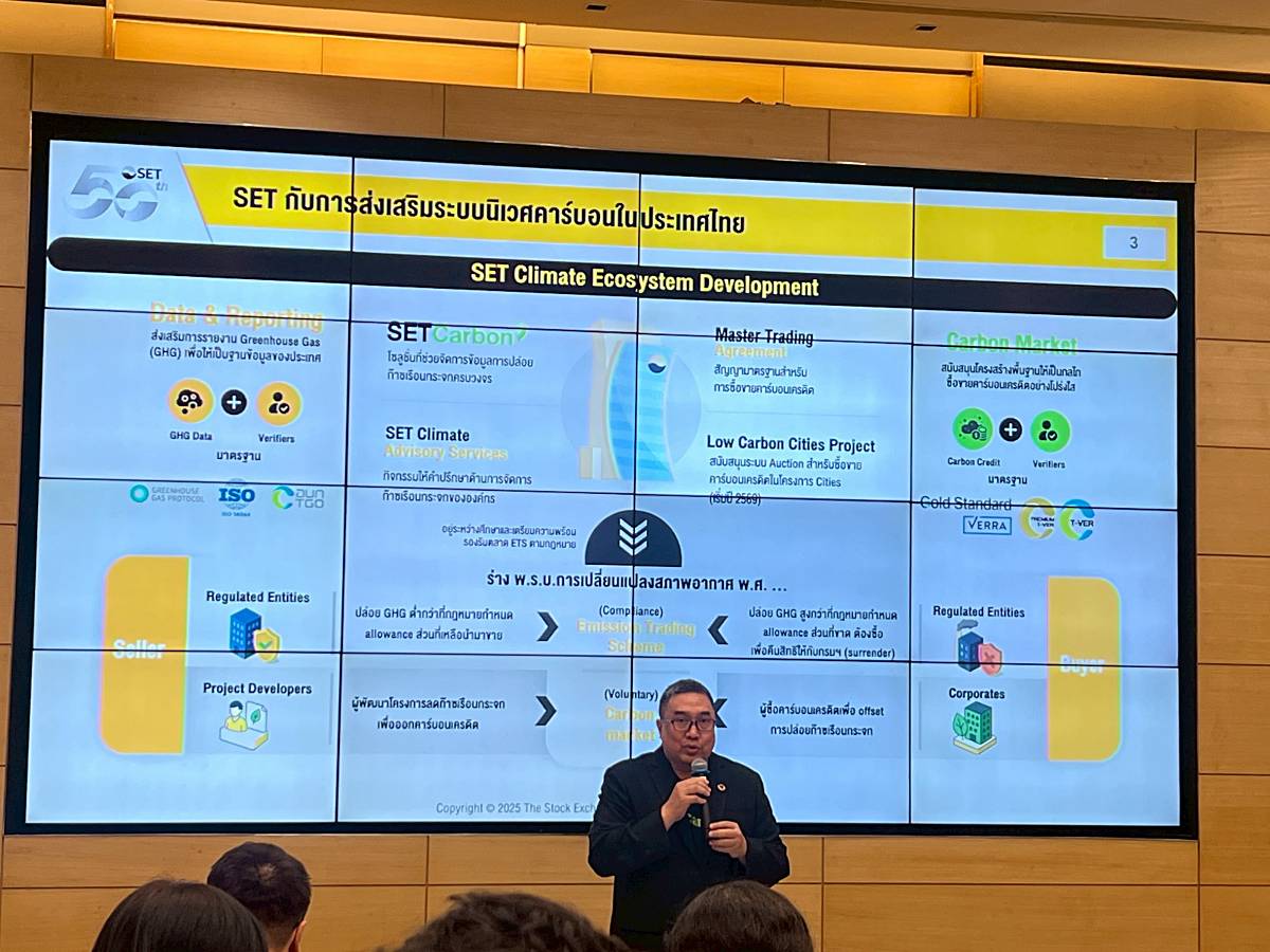 อีกหนึ่งความสำเร็จของ ‘ตลาดหลักทรัพย์แห่งประเทศไทย’ (SET) หลังพัฒนา SETCarbon แพลตฟอร์มดิจิทัลเพื่อช่วยจัดการข้อมูลคาร์บอนของภาคธุรกิจ โดยนำร่องแซนด์บ็อกซ์เพื่อทดลองใช้ผ่าน 20 บริษัทจดทะเบียน และ 7 ผู้ทวนสอบ (Verifier) จนสามารถเปิดใช้บริการอย่างเป็นทางการได้เมื่อต้นปี 2025 ที่ผ่านมา