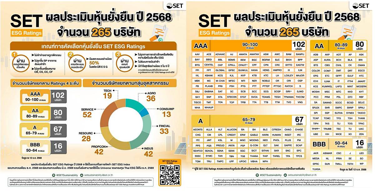 ผู้สนใจสามารถดูผลประเมินหุ้นยั่งยืน SET ESG Ratings ปี 2568 และเข้าใช้งาน ESG Online Assessment ได้ที่ www.setsustainability.com/ESG-ratings
