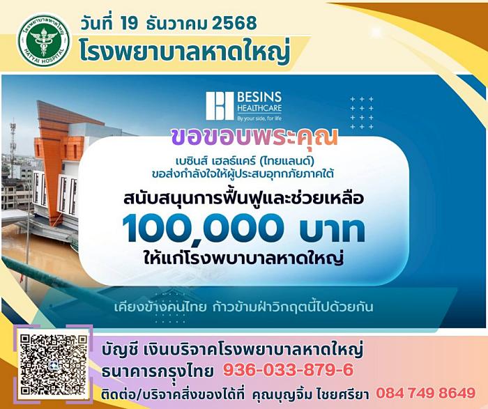 บริษัท เบซินส์ เฮลธ์แคร์ (ไทยแลนด์) แสดงพลังน้ำใจและความห่วงใยต่อผู้ประสบอุทกภัยในพื้นที่ภาคใต้ สนับสนุนการฟื้นฟูและช่วยเหลือผู้ได้รับผลกระทบจากสถานการณ์น้ำท่วม ด้วยการมอบเงินบริจาคจำนวน 100,000 บาท ให้แก่ โรงพยาบาลหาดใหญ่ เพื่อใช้ในการดูแลรักษาผู้ป่วยและสนับสนุนภารกิจด้านสาธารณสุข