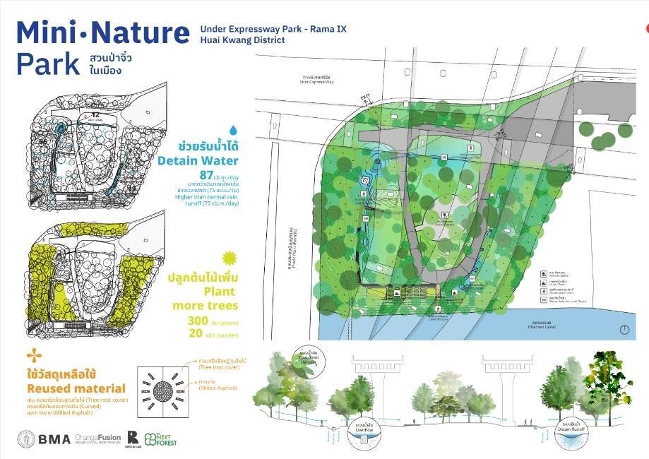 กองทุนรวม คนไทยใจดี (BKIND) โดย BBLAM จึงเข้ามาสนับสนุนให้ โครงการ Mini Nature Park สวนป่าจิ๋วในเมือง เกิดขึ้นจริง ทั้งด้านงบประมาณ ความร่วมมือและการเชื่อมพลังพันธมิตรที่เชี่ยวชาญแต่ละด้านเข้าด้วยกัน เพื่อให้สวนป่าจิ๋วแห่งนี้เป็นตัวอย่างของการขับเคลื่อนเมืองอย่างยั่งยืน ทีมงานเริ่มจากการสำรวจระดับดิน ออกแบบร่องรับน้ำ ปรับการจัดการน้ำฝน และปลูกพรรณไม้พื้นถิ่นกว่า 280 ต้น ที่เหมาะกับสภาพใต้ทางด่วน โดยนำวัสดุเดิมในพื้นที่กลับมาใช้ใหม่อย่างคุ้มค่า เพราะเป้าหมายไม่ใช่เพียง “ปลูกต้นไม้เพิ่ม” แต่คือ การสร้างระบบนิเวศที่เติบโตได้จริง ในบริบทของเมือง