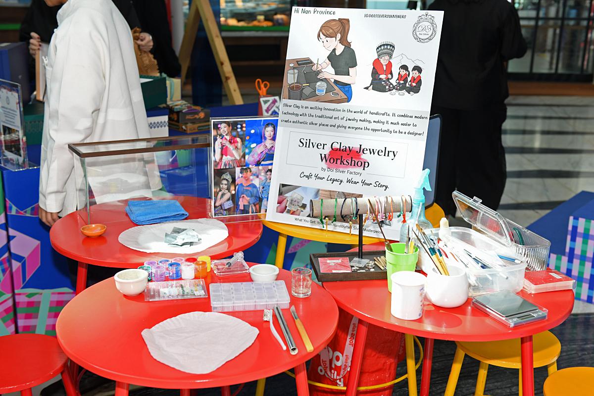 งานปีนี้ยังเปิดโอกาสให้ลูกค้าได้สัมผัส Craft ไทยจากแหล่งกำเนิดภูมิปัญญา ผ่าน Thai Workshop ระหว่างวันที่ 18–28 ธันวาคม 2568 เวลา 12:00–17:00 น. โดยผู้ประกอบการจาก 6 ชุมชนร่วมถ่ายทอดทักษะอย่างใกล้ชิด เช่น การประดิษฐ์ ‘ม้าโชคดี‘ จากเศษผ้าขาวม้าของแบรนด์ Pahkahmah Thailand, เพ้นท์พวงกุญแจจาก Nineshop99, ทำเครื่องประดับเงินกับช่างฝีมือจาก ดอยซิลเวอร์ จังหวัดน่าน, ประกอบสร้อยไข่มุกจาก PRIMA PEARL, เพ้นท์เซรามิกศิลาดลจาก เชียงใหม่ ศิลาดล และประดิษฐ์เครื่องประดับหินจากบ้านช้างดีไซน์ จังหวัดชลบุรี