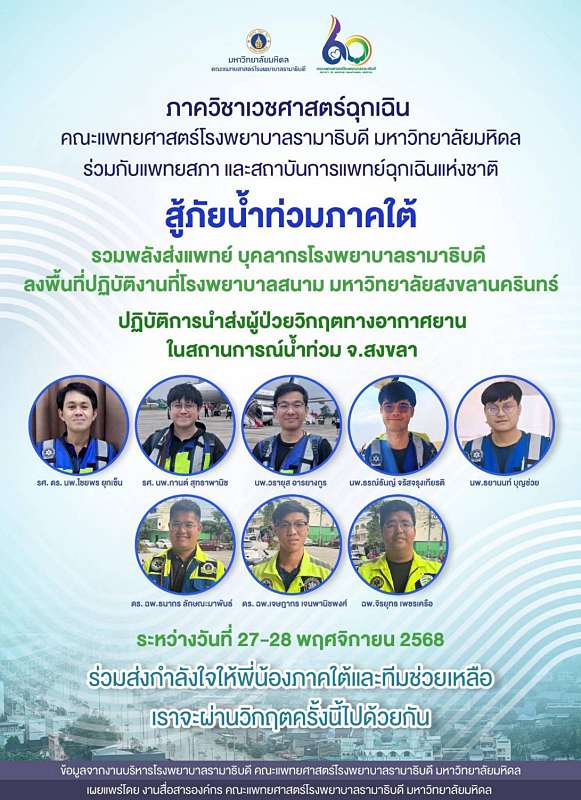 ด้วยความมุ่งมั่นในการยืดหยัดเคียงข้างประชาชนในทุกสถานการณ์ที่ไม่คาดฝัน ภาควิชาเวชศาสตร์ฉุกเฉิน คณะแพทยศาสตร์โรงพยาบาลรามาธิบดี มหาวิทยาลัยมหิดล ร่วมกับแพทยสภา และสถาบันการแพทย์ฉุกเฉินแห่งชาติ สนับสนุนทีมแพทย์ทางอากาศและเทคโนโลยีการรักษาเพื่อช่วยบรรเทาวิกฤตมหาอุทกภัย ณ อำเภอหาดใหญ่ จังหวัดสงขลา ในช่วงต้นเดือนธันวาคม 2568 ที่ผ่านมา