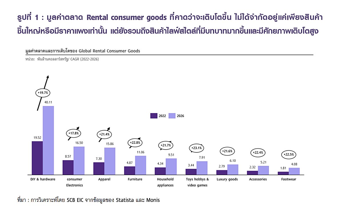SCB EIC ระบุว่า ผู้บริโภคในปัจจุบัน โดยเฉพาะกลุ่ม Millennials และ Gen Z มองว่าการเป็นเจ้าของสินค้าไลฟ์สไตล์บางอย่าง เช่น เสื้อผ้า อุปกรณ์กีฬา อาจนำมาสู่ภาระตามมา เช่น การดูแลรักษา การหาพื้นที่จัดเก็บ ทำให้ผู้บริโภครุ่นใหม่เริ่มหันมาเช่าสินค้า แทนการซื้อมากขึ้น โดยให้ความสำคัญกับแนวคิด ‘การเข้าถึงสินค้า’ มากกว่า ‘การเป็นเจ้าของสินค้า’ ตามหลักการ เศรษฐกิจแบ่งปัน (Sharing Economy) ส่งผลให้รูปแบบ ‘การเช่า’ ซึ่งเป็นส่วนหนึ่งของเศรษฐกิจแบ่งปันเติบโตเพิ่มขึ้น