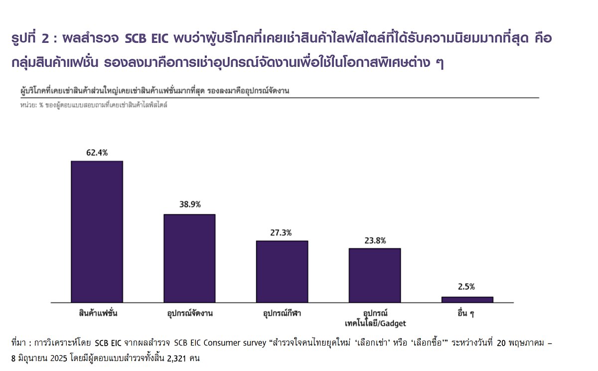 แม้ว่าการเช่าสินค้ากลุ่มแฟชั่น จะเป็นธุรกิจที่เป็นที่รู้จักมากที่สุด แต่ Rental economy กำลังขยายตัวไปยังกลุ่มสินค้าไลฟ์สไตล์อื่นๆ มากขึ้น ตั้งแต่สินค้าที่ใช้ประจำวัน ไปจนถึงอุปกรณ์เฉพาะทางต่างๆ โดยพบว่าผู้บริโภคไทยที่เคยเช่าสินค้าไลฟ์สไตล์แล้ว มีแนวโน้มที่จะเช่าอีกในอนาคต ขณะที่กว่า 60% ของกลุ่มที่ยังไม่เคยเช่าสินค้าไลฟ์สไตล์ มีแนวโน้มที่จะเข้าสู่ตลาดนี้ในอนาคต
