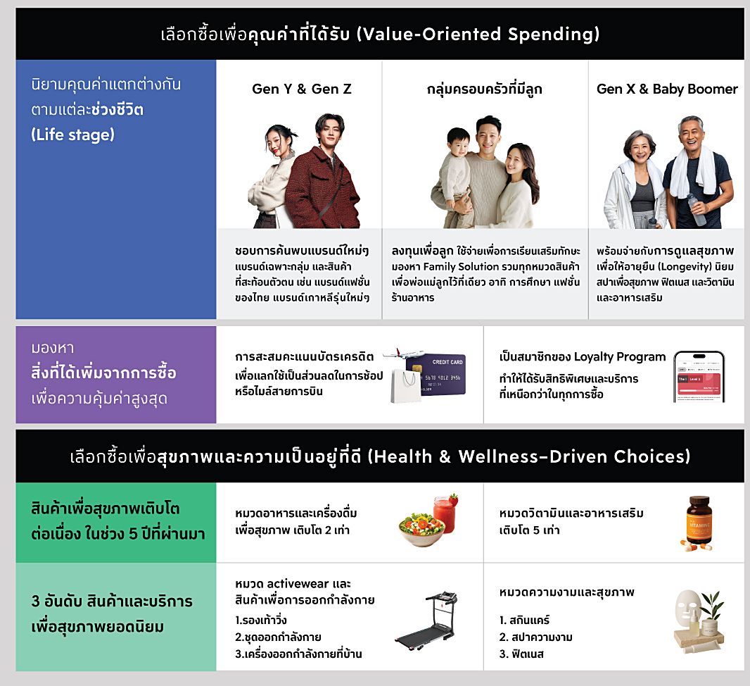 ในส่วนของการใช้จ่ายเพื่อ คุณค่าที่ได้รับ (Value-Oriented Spending) แสดงให้เห็นว่าผู้บริโภคกำลังนิยาม “ความคุ้มค่า” ใหม่ จากเดิมที่มองราคาหรือส่วนลด เป็นการมองหาสิ่งที่ตอบโจทย์ชีวิตในตอนนี้ ทำให้แต่ละช่วงวัยมีนิยามคุณค่าที่แตกต่างกัน