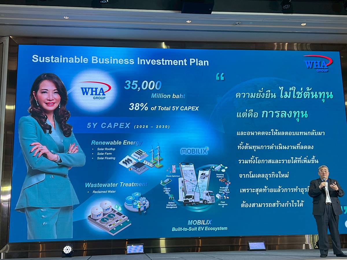 “WHA ขับเคลื่อนความยั่งยืนในธุรกิจ ด้วยความเชื่อว่า Green ต้องกินได้ และมุมมองต่อความยั่งยืน ที่ไม่ได้มองเป็นต้นทุน แต่เป็นโอกาสทางธุรกิจที่จับต้องได้ ซึ่งสามารถสร้างสมดุลระหว่างการเติบโตของธุรกิจ และการดำเนินงานด้านความยั่งยืนให้ขับเคลื่อนไปได้พร้อมกัน ซึ่งสามารถพิสูจน์ผ่านรายได้จากฝั่ง Green Business ที่ทำรายได้แตะหลัก 1 พันล้านบาทแล้ว จาก 3 กลุ่มธุรกิจทั้ง Green Mobility , พลังงานทดแทน (Renewable) และการบำบัดทรัพยากรน้ำ (Reclamation Water) ซึ่งทุกธุรกิจมีโอกาสเติบโตสูงในอนาคต โดยเชื่อว่าการเติบโตจากฟาก Green Business ในปีนี้จะเพิ่มขึ้นเป็น 1,500 ล้านบาท และสามารถเติบโตได้ก้าวกระโดดในอนาคต และมีรายได้เติบโตเป็นกว่าปีละ 12,000 ล้านบาท ภายในปี 2573 และมีแผนเดินหน้าลงทุนในฟากธุรกิจสีเขียวต่อเนื่อง โดยตั้งเป้าใช้งบลงทุนในช่วง 5 ปีจากนี้ ไว้รวมกว่า 35,000 ล้านบาท หรือคิดเป็น 38% ของเม็ดเงินลงทุนทั้งหมดที่จะใช้ในช่วง 5 ปีนี้”