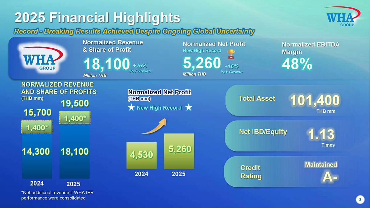 แต่ WHA มองว่าประเทศไทยยังคงเต็มไปด้วยโอกาสในการเติบโต จากการเร่งปรับตัวและวางกลยุทธ์เพื่อรับมือการเปลี่ยนแปลง เพื่อรองรับโอกาสในการเติบโตให้ธุรกิจได้อย่างต่อเนื่อง สะท้อนผ่านความสำเร็จจากผลการดำเนินงานในปีล่าสุด ที่ WHA ยังคงสามารถรักษาการเติบโตของกำไรและสร้าง New Record High ได้ต่อเนื่องเป็นปีที่ 4 และเติบโตได้มากกว่าเป้าหมายที่วางไว้ โดยมีกำไรเติบโต 16% หรือกว่า 5,260 ล้านบาท จากเป้าหมายที่ตั้งไว้ 4,900 ล้านบาท ขณะที่รายได้เติบโต 26% หรือมีรายได้กว่า 18,100 ล้านบาทเมื่อเทียบกับปีก่อน