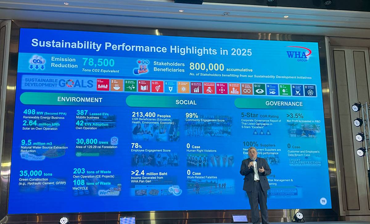 คุณณัฐพรรษ ตันบุญเอก ประธานเจ้าหน้าที่การเงินกลุ่ม บริษัท ดับบลิวเอชเอ คอร์ปอเรชั่น จำกัด (มหาชน) กล่าวเพิ่มเติมถึงการให้ความสำคัญในการขับเคลื่อนความยั่งยืนของ WHA และเป็นหนึ่งกลยุทธ์หลักของทุกธุรกิจเพื่อสามารถสร้าง Positive Impact จากการเำเนินธุรกิจ ครอบคลุมตาม ESG Framework ทั้งมิติสิ่งแวดล้อม (Environmental) ที่สามารถลดการปล่อยคาร์บอนจากการดำเนินธุรกิจในปีที่ผ่านมาได้รวมกว่า 78,500 ตันคาร์บอนไดออกไซด์เทียบเท่า พร้อมสร้างประโยชน์ภายใน Stakeholders ได้ราว 8 แสนราย ขณะที่ในมิติสังคม (Social) จากการขับเคลื่อนโครงการเพื่อสังคม เพื่อการดูแลชุมชนโดยรอบทั้งเรื่องการศึกษา สุขภาพ รวมทั้งการส่งเสริมสภาพแวดล้อมและเศรษฐกิจไปสู่ผู้คนมากกว่า 213,400 คน รวมทั้งสร้างให้เกิดเป็นรายได้กลับไปสูชุมชนรวมกว่า 2,4 ล้านบาท และการดูแลคู่ค้า และพนักงานต่อเนื่อง ไปจนถึงอัตราการร้องเรียนเรื่องต่างๆ อาทิ สิทธิมนุษยชน หรือการได้รับอันตรายขณะปฏิบัติงานเป็นศูนย์ เช่นเดียวกับด้านธรรมาภิบาล (Governance) ผ่านคะแนนการจัดอันดับความเชื่อมั่นตามมาตรฐานทั้งระดับประเทศ และในระดับโลก ตามแนวทางขับเคลื่อนตามหลักธรรมาภิบาลและความโปร่งใสในการดำเนินธุรกิจ