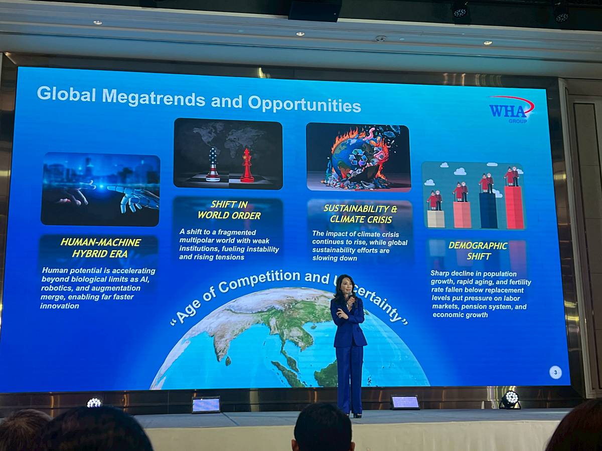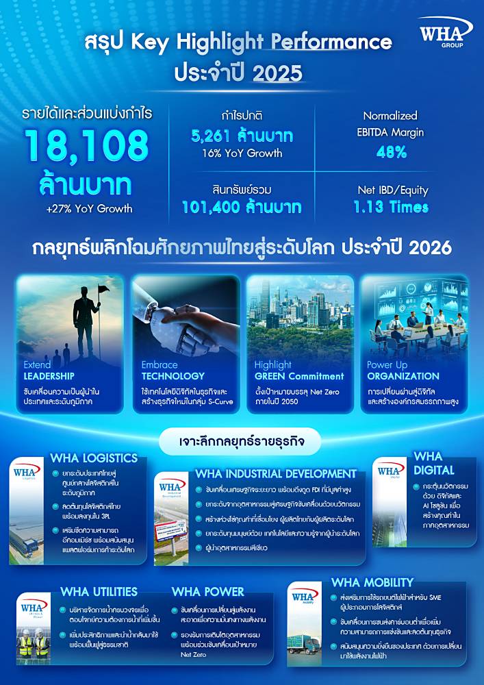 “ปี 2569 เป็นปีแห่งความท้าทายรอบด้าน ทั้งภูมิรัฐศาสตร์ที่ซับซ้อน และการเผชิญหน้าทางภูมิเศรษฐศาสตร์ พลวัตการค้าโลกที่ผันผวน เทคโนโลยี AI และดาต้าที่เปลี่ยนอุตสาหกรรม รวมถึงแนวโน้มด้าน ESG ที่เป็นมาตรฐานบังคับและมาตรการการค้าโลกที่เข้มงวดขึ้น อย่างไรก็ตาม WHA มองว่านี่คือโอกาสของประเทศไทยในการยกระดับโครงสร้างพื้นฐาน พลังงานสะอาด และระบบนิเวศอุตสาหกรรมครบวงจร เพื่อรองรับเศรษฐกิจใหม่ (New Economy) โดยเฉพาะกลุ่ม EV เซมิคอนดักเตอร์ ดาต้าเซ็นเตอร์ คลาวด์ และพลังงานหมุนเวียน ผ่านพันธกิจ WHA: SHAPE THE FUTURE FOR THAILAND เพื่อยกระดับประสิทธิภาพทั้งองค์กร ผ่านการเชื่อมโยงแพลตฟอร์มเข้าสู่ระบบนิเวศเดียว ผสานเทคโนโลยีและนวัตกรรมเพื่อสร้างมูลค่าเพิ่มสูงสุดแก่ผู้มีส่วนได้เสีย”