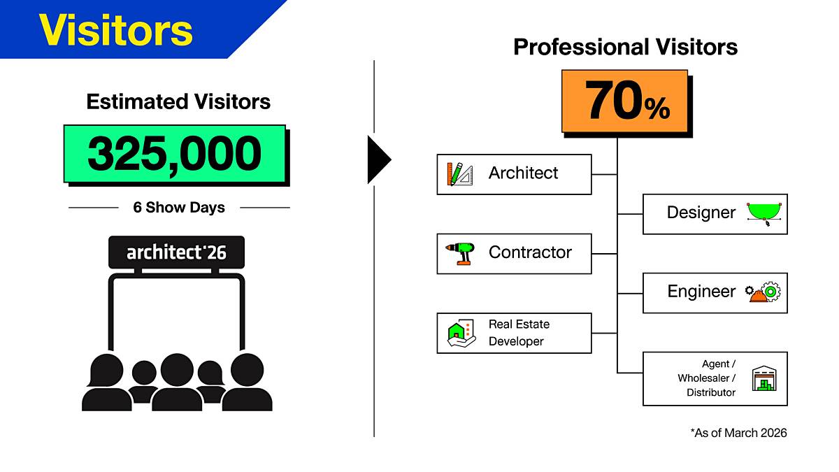 ในจำนวนนี้เป็นผู้แสดงสินค้าใหม่ถึง 201 บริษัท คิดเป็น 23.05% ของพื้นที่จัดแสดงทั้งหมด ขณะเดียวกันยังมีผู้แสดงสินค้าจากต่างประเทศ คิดเป็นสัดส่วนประมาณ 10% ของพื้นที่ โดยมาจากหลากหลายประเทศ อาทิ จีน ญี่ปุ่น เกาหลีใต้ อินเดีย สิงคโปร์ มาเลเซีย เวียดนาม ไต้หวัน อิตาลี โรมาเนีย และโครเอเชีย เป็นต้น ด้านผู้ชมงานคาดว่าจะมีจำนวนกว่า 325,000 คน ตลอดระยะเวลา 6 วัน โดยเป็นกลุ่มผู้เชี่ยวชาญในอุตสาหกรรม (Professional Visitors) ถึงประมาณ 70% ครอบคลุมสถาปนิก นักออกแบบ วิศวกร ผู้รับเหมา ผู้พัฒนาอสังหาริมทรัพย์ และตัวแทนจำหน่ายวัสดุก่อสร้าง ซึ่งล้วนเป็นกลุ่มผู้มีอำนาจตัดสินใจทางธุรกิจ ปัจจุบัน งานสถาปนิก’69 ได้รับความสนใจจากผู้เข้าชมอย่างต่อเนื่อง โดยมีผู้ลงทะเบียนเข้าชมงานล่วงหน้าแล้วจำนวน 4,584 ราย เพิ่มขึ้น 0.8% เมื่อเทียบกับช่วงเวลาเดียวกันของปีก่อน โดยสัดส่วนผู้ลงทะเบียนส่วนใหญ่เป็นกลุ่ม Professional Visitors สูงถึง 69.6% หรือคิดเป็นจำนวน 3,190 ราย และเป็นผู้เข้าชมภายในประเทศคิดเป็น 97.5% และมีผู้เข้าชมจากต่างประเทศอยู่ที่ 2.5% สะท้อนถึงบทบาทของงานสถาปนิกในฐานะเวทีระดับนานาชาติที่เชื่อมโยงเครือข่ายธุรกิจในอุตสาหกรรมก่อสร้างและการออกแบบ