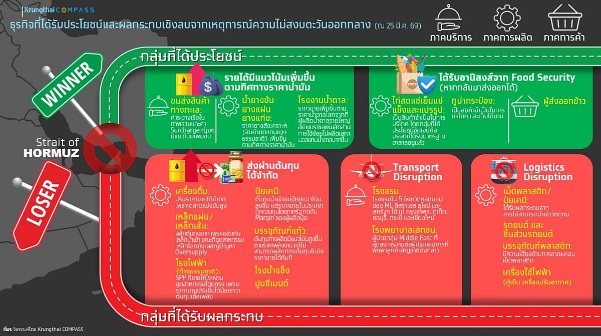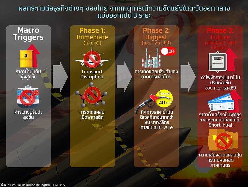 Krungthai COMPASS ประเมินว่า หากการปิดช่องแคบฮอร์มุซและการสู้รบมีแนวโน้มกินระยะเวลา 3 เดือน (มี.ค.-พ.ค. 69) จะกระทบต่อธุรกิจไทยแบ่งออกเป็น 3 ระยะ ได้แก่