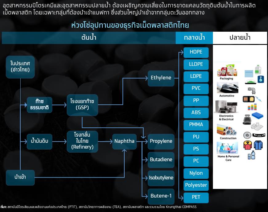 – ปัญหาขาดแคลนสินค้าที่รุนแรงขึ้น อาจมีการปิดโรงงานปิโตรเคมีขั้นต้นเพิ่มขึ้น ซึ่งอาจทำให้ Ethylene และ Propylene หายไปจากระบบอย่างน้อยราว 1.2 ล้านตัน หรือราว 13.8% ของกำลังการผลิตทั้งหมดของไทย ทำให้สต็อกแนฟทาไม่เพียงพอต่อการผลิต รวมถึงกลุ่ม SMEs ที่มีข้อจำกัดในการเข้าถึงแหล่งวัตถุดิบ และส่งผลกระทบไปยังอุตสาหกรรมปลายน้ำ ด้านผู้ผลิตบรรจุภัณฑ์พลาสติกอาจได้รับผลกระทบด้านต้นทุนจากราคาเม็ดพลาสติก ซึ่งป็นวัตถุดิบหลักคิดเป็นสัดส่วนราว 60-70% ของต้นทุนรวม ส่วนบริษัทปิโตรเคมีที่มีโรงกลั่นน้ำมันภายในประเทศ รวมถึงใช้น้ำมันดิบและก๊าซธรรมชาติจากอ่าวไทย ซี่งมีสัดส่วนราว 40-50% ยังมีแนวโน้มดำเนินการผลิตได้ตามปกติ แต่ยังคงได้รับแรงกดดันจากต้นทุนการผลิตที่มีแนวโน้มเพิ่มสูง