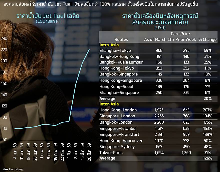 -ราคาตั๋วเครื่องบินที่มีโอกาสยืนสูงเป็นระยะเวลานาน อาจทำให้กลุ่ม Short-haul ชะลอการเดินทาง เนื่องจากราคาน้ำมัน Jet Fuel เพิ่มสูงขึ้นกว่า 100% ประกอบกับจำนวนเที่ยวบินที่ถูกยกเลิกจากการจำกัดน่านฟ้าในตะวันออกกลาง ทำให้ราคาตั๋วเครื่องบินหลายเส้นทางปรับสูงขึ้น กระทบกำลังซื้อนักท่องเที่ยว Short-haul ในอนาคต รวมทั้งเกิด Downside ต่อจำนวนนักท่องเที่ยวต่างชาติในปี 2569