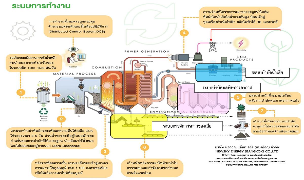 สำหรับกระบวนการกำจัดขยะใช้เทคโนโลยีที่เป็นมิตรกับสิ่งแวดล้อม โดยขยะถูกนำมาเทในบ่อพักภายในอาคารระบบปิด 3–5 วัน เพื่อลดความชื้น ใช้เครนคีบขยะเข้าสู่ เตาเผาแบบตะกรับ (Stoker Type) ควบคุมอุณหภูมิประมาณ 850–1,100°C นำความร้อนต้มน้ำเป็นไอน้ำแรงดันสูง หมุนกังหันไอน้ำผลิตกระแสไฟฟ้าได้ประมาณ 30 เมกะวัตต์ต่อวัน ซึ่งปริมาณไฟฟ้าที่ผลิตได้จะนำไปจำหน่ายให้กับการไฟฟ้าฝ่ายผลิต (EGAT) ในราคาหน่วยละ 3.66 บาท ขณะเดียวกันยังมีรายได้จากการกำจัดขยะในราคา 789 บาท/ตัน