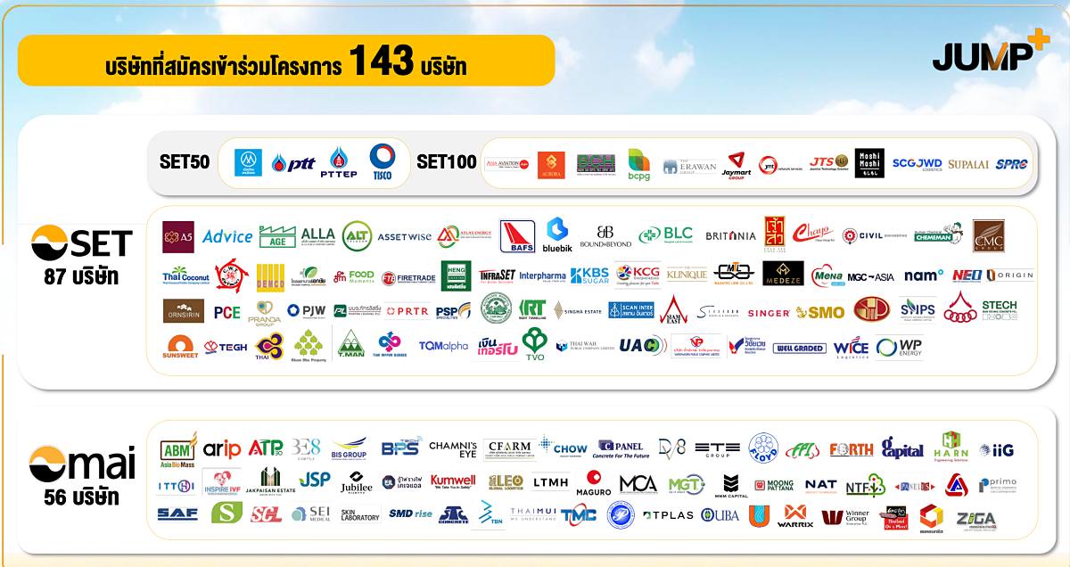 หลังแนะนำโครงการตั้งแต่ปีที่ผ่านมา และได้เริ่มเดินหน้าเปิดโครงการอย่างเป็นทางการแล้ว ปัจจุบันมี บจ. เข้าร่วมโครงการ JUMP+ รวม 143 บริษัท หรือคิดเป็น 16% จากจำนวน บจ. ทั้งหมด 868 บริษัท โดย บจ. ที่เข้าร่วมโครงการทั้งหมดต้องทำการส่งแผนพัฒนาธุรกิจระยะยาว 3 ปี ครอบคลุมทั้งแผนงานด้านธุรกิจ แผนด้านธรรมาภิบาล และแผนจัดการก๊าซเรือนกระจก