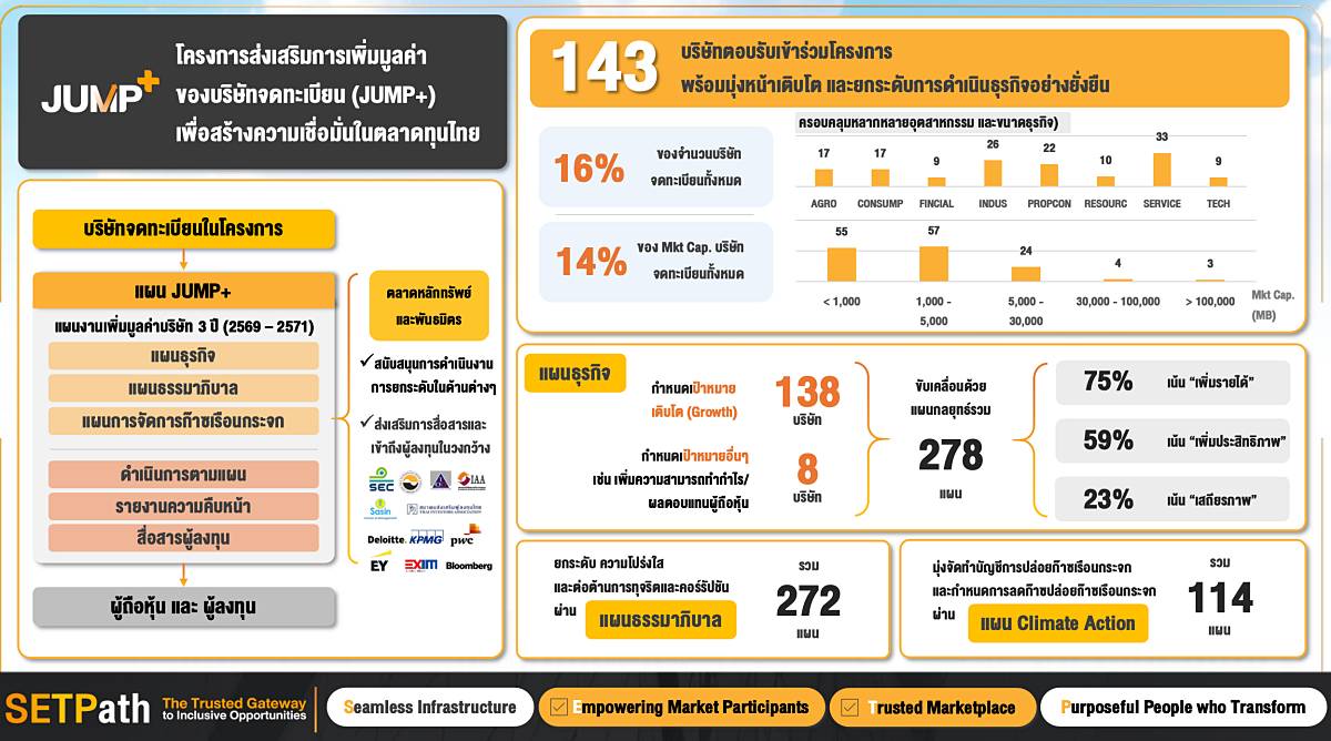 ตลาดหลักทรัพย์แห่งประเทศไทย เดินหน้าโครงการ JUMP+ เพื่อยกระดับศักยภาพและเพิ่มมูลค่าของบริษัทจดทะเบียนไทย (บจ.) พร้อมสร้างความเชื่อมั่นให้นักลงทุน และเสริมความแข็งแกร่งของตลาดทุนไทยในระยะยาว