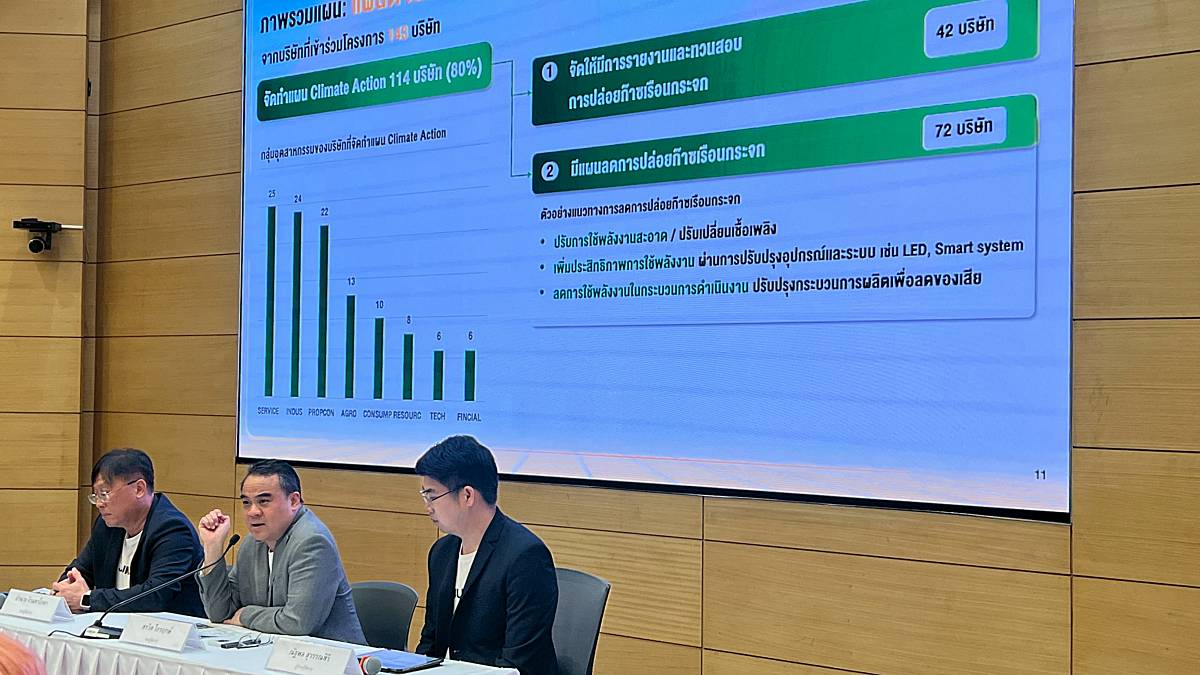 – สำหรับแผนการจัดการก๊าซเรือนกระจก (Climate Action Plan) ได้กำหนดไว้เป็นทางเลือกแบบสมัครใจ แต่มี บจ. ถึง 80% หรือจำนวน 114 บริษัท ได้นำเสนอแผนดังกล่าวเข้ามาด้วย และมีถึง 42 บริษัท ที่ยังไม่เคยเปิดเผยข้อมูลเกี่ยวกับ Climate Action Plan มาก่อน และได้เริ่มจัดทำแผนด้านการรายงานและทวนสอบการปล่อยก๊าซเรือนกระจกเมื่อมาเข้าโครงการ ขณะที่ 72 บริษัท ได้ส่งแผนเพื่อลดการปล่อยก๊าซเรือนกระจก (GHG Emission) ในองค์กร พร้อมตั้งเป้าหมายลด GHG Emission เฉลี่ย 12.8% ภายในปี 2571 สะท้อนถึงการให้ความความสำคัญด้าน ESG ควบคู่ไปกับการดำเนินธุรกิจ
