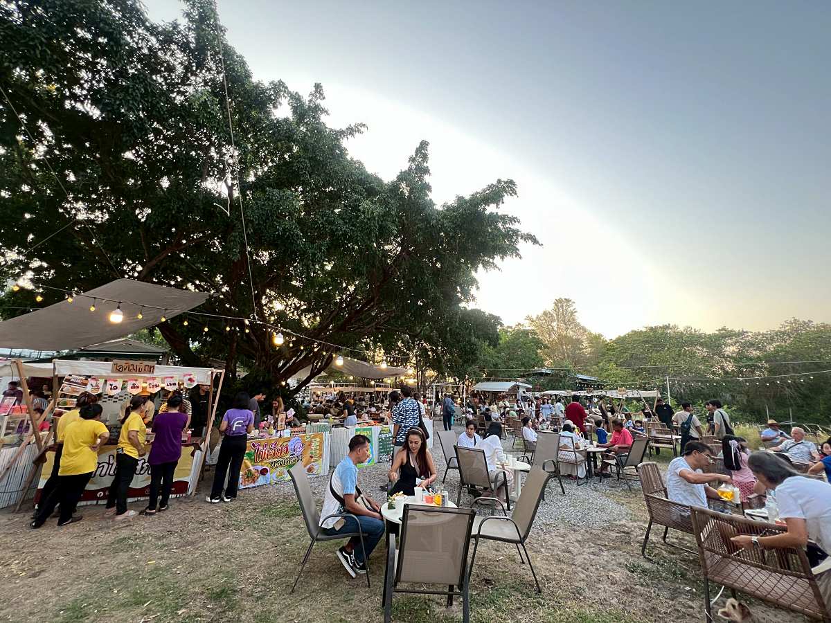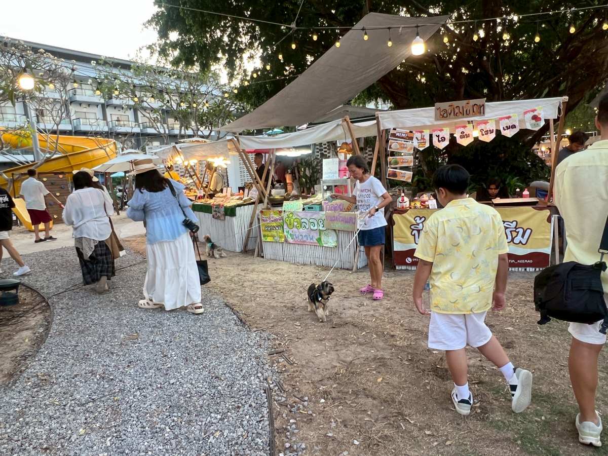 นอกจากนี้ ทุกวันเสาร์ที่สองของทุกเดือน ทางรีสอร์ทยังเปิดพื้นที่เป็น ‘ตลาดนัดชุมชนสวนสนลอย’ เพิ่มโอกาสให้เกษตรกร ผู้ประกอบการ ไปจนถึงช่างฝีมือในท้องถิ่น มีพื้นที่สำหรับจำหน่ายสินค้าหรือผลผลิตของตัวเองเพิ่มมากขึ้น พร้อมทั้งให้นักท่องเที่ยวมีโอกาสได้สัมผัสวิถีชีวิตของชาวเพชรบุรีอย่างใกล้ชิด ผ่านสินค้าชุมชนหลากหลายกว่า 40 ร้านค้า ในราคาจับต้องได้ง่าย เต็มพื้นที่ราว 1 ไร่นี้ ทั้งอาหาร เครื่องดื่ม ขนม ผลไม้ท้องถิ่น ไปจนถึงเสื้อผ้า เครื่องประดับ ที่สะท้อนศิลปะ และงานช่างฝีมือ เพื่อสะท้อนภูมิปัญญาและวัฒนธรรมของท้องถิ่นได้อีกทางหนึ่ง โดยร้านค้าในพื้นที่ตลาดจะเริ่มตั้งและมีความคึกคักในช่วงบ่ายๆ ราว 16.00 น. ถึงช่วงเวลาประมาณ 21.00 น.