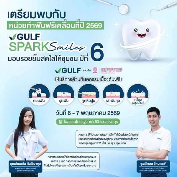 ด้วยแนวคิด ‘Powering the Future, Empowering the People’ ที่มุ่งสร้างสรรค์คุณภาพชีวิตที่ดีขึ้นสำหรับทุกคนทั้งภายในและภายนอกองค์กร GULF จึงร่วมกับคณะทันตแพทยศาสตร์ จุฬาลงกรณ์มหาวิทยาลัย ริเริ่มและสนับสนุนโครงการ “GULF Sparks Smiles มอบรอยยิ้มสดใสให้ชุมชน” มาอย่างต่อเนื่องเป็นปีที่ 6 เพื่อส่งเสริมให้ทุกคน โดยเฉพาะชุมชนในพื้นที่ห่างไกล มีสุขภาพฟันที่แข็งแรงและรอยยิ้มที่สดใส ผ่านการเข้าถึงโอกาสรักษาทางทันตกรรมขั้นพื้นฐาน เช่น การอุดฟัน ถอนฟัน ขูดหินปูน ผ่าตัดฟันคุด อย่างทั่วถึงและเท่าเทียม ซึ่งเป็นหนึ่งในรากฐานสำคัญของการสร้างสังคมที่มีสุขภาวะและคุณภาพชีวิตที่ดี โดยตลอดระยะเวลาที่ผ่านมา โครงการฯ ประสบสำเร็จในการส่งเสริมสุขภาพช่องปากของประชาชนไปแล้วกว่า 6,500 คน และยังเดินหน้าส่งต่อรอยยิ้มสดใสอย่างต่อเนื่องในปี 2569