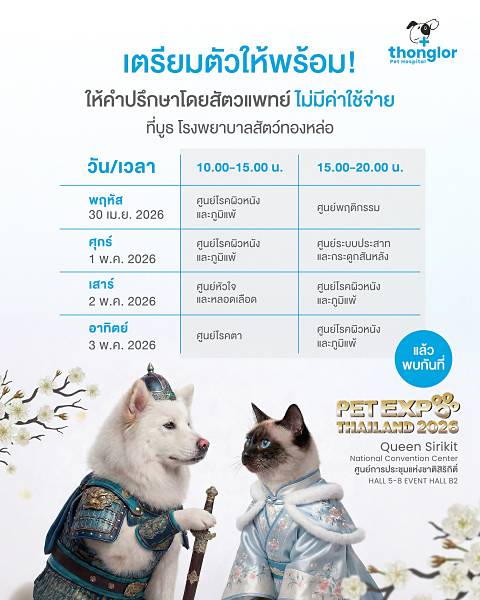 เตรียมตัวให้พร้อม แล้วพาเหล่าลูกรักสี่ขามาพบกันที่บูธโรงพยาบาลสัตว์ทองหล่อ ในงาน Pet Expo Thailand 2026 ระหว่างวันที่ 30 เมษายน – 3 พฤษภาคม 2026 ณ ศูนย์การประชุมแห่งชาติสิริกิติ์ (QSNCC) Hall 5-8 Event Hall B2 มาร่วมเติมเต็มความรักและดูแลสุขภาพของเพื่อนรัก พิทักษ์หัวใจไปด้วยกัน