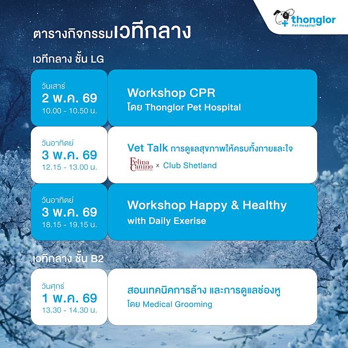 - 2 พ.ค. (เวที LG) : Workshop CPR การกู้ชีพพื้นฐานเพื่อช่วยชีวิตสัตว์เลี้ยงในภาวะฉุกเฉิน